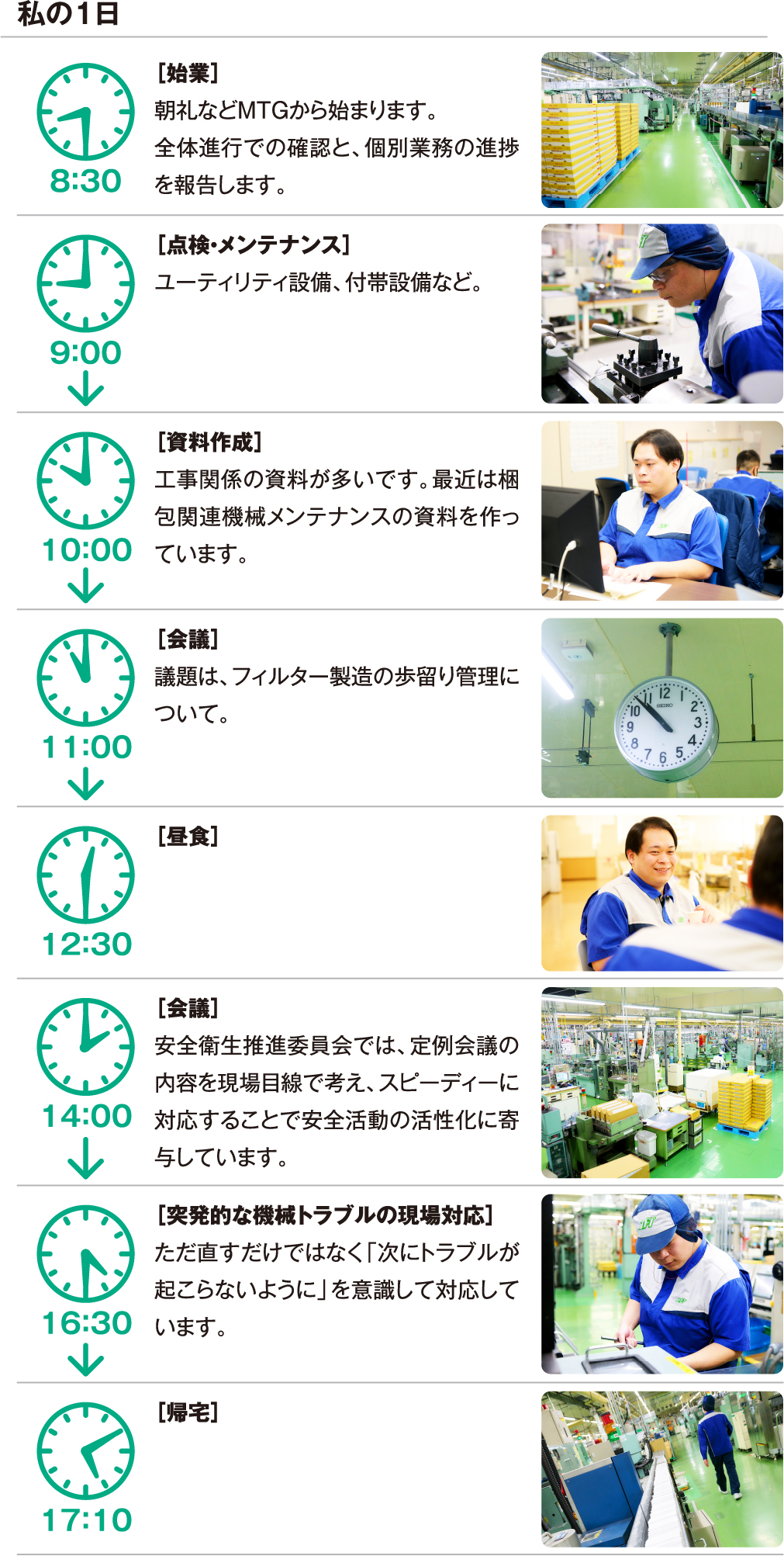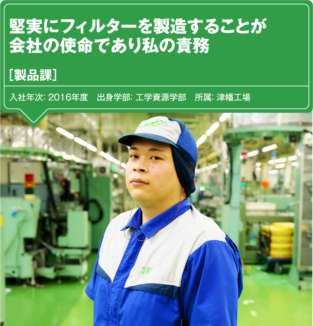 実際に入社してみると、新製品の企画・開発ではなく、堅実にフィルターを製造することが会社の使命であったため少々ギャップを感じましたが、現在では機械改作時に工作設備を使って既存部品を加工したり、自分で図面を作成して部品を作ったりと、メンテナンスの面で自分の発想を形にしており、やりがいを感じています。