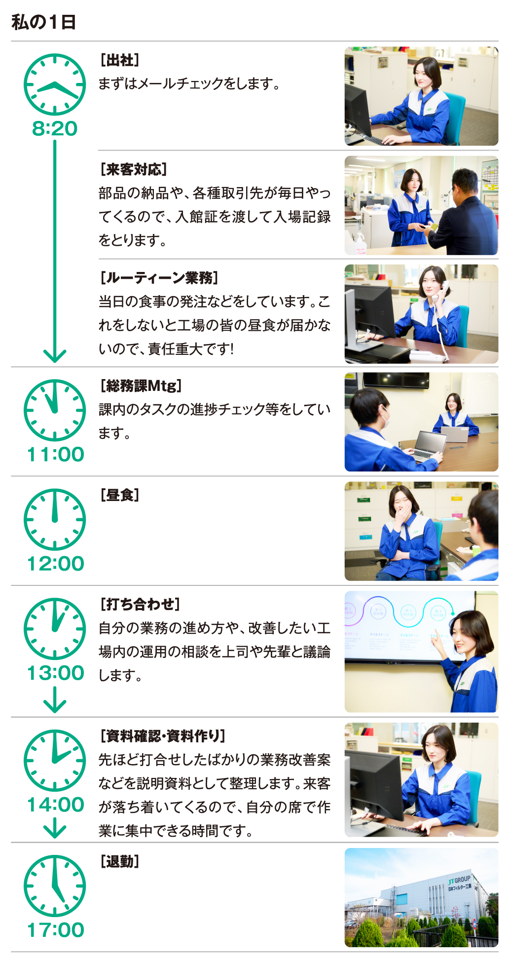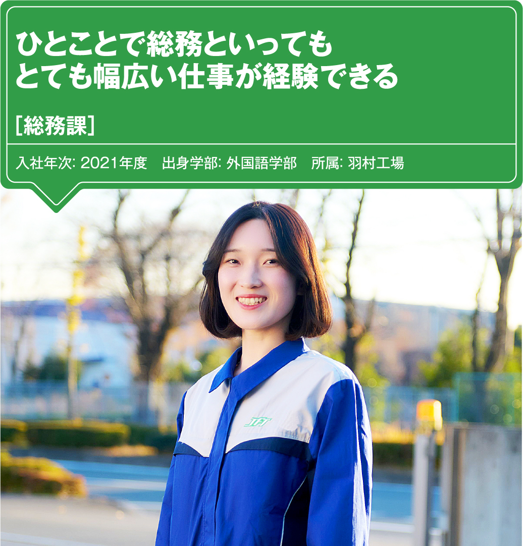 私は学生時代から男子バレーボールが好きでJTサンダースを応援していたため、そのJTグループの会社ということでJFTにも興味を持ちました。就職活動においては製造業を中心に考えていた中で、なかでも珍しい商品を作っている会社を探していたので、国内でたばこ用フィルターを独占的に作っているという点で、JFTは自分の希望にぴったり!と感じたのを覚えています。